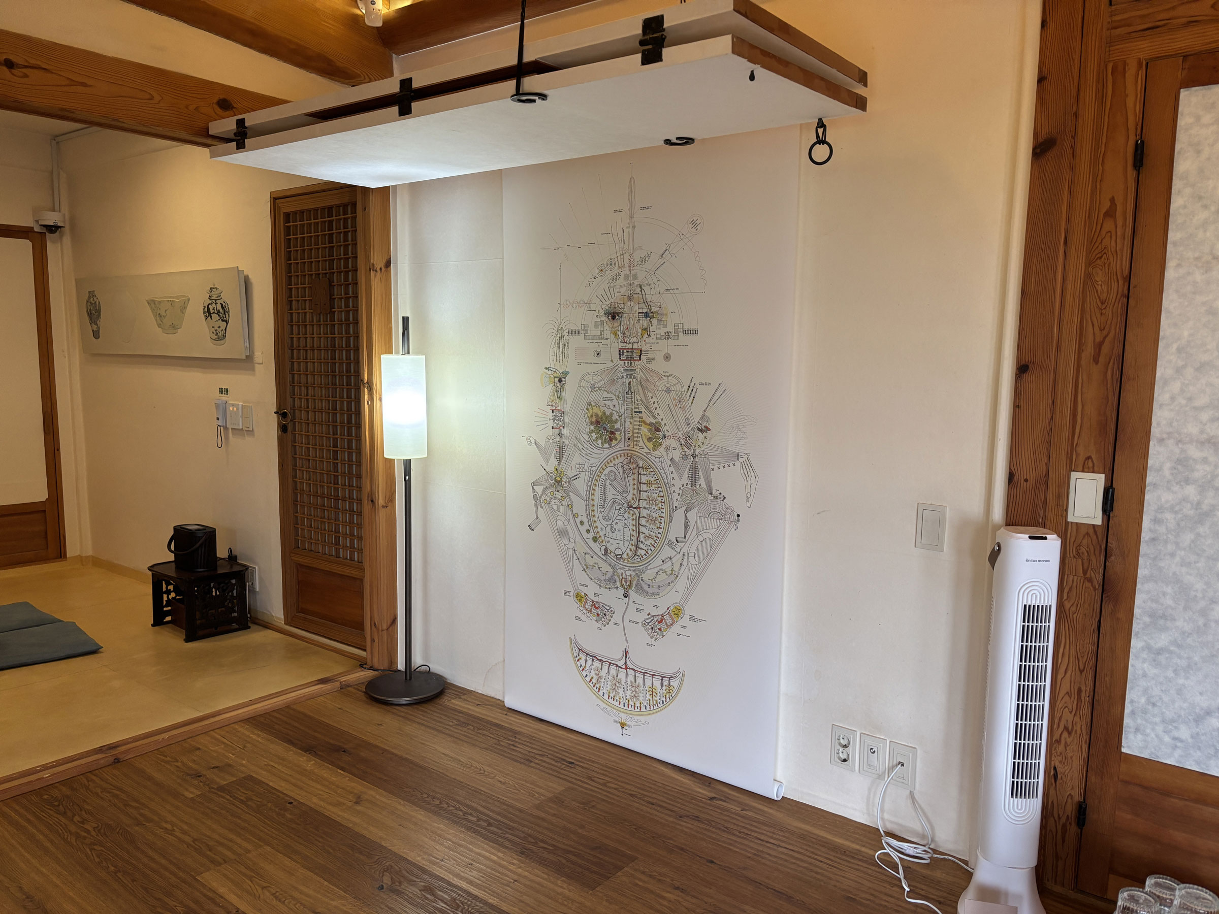 [이데일리 이윤정 기자] 전시장에 들어서면 커다란 해부학 도면이 시선을 사로잡는다. 인체의 내부 구조를 설명한 해부도면 같지만, 자세히 들여다보면 한 사람의 인생이 담겨 있다. 바로 안민정(43) 작가의 ‘자화상’(2007)이다. 배에 남은 흉터라든지, 어린 시절 허벅지에 말벌에 쏘인 자국, 속옷 사이즈까지 설명과 함께 표시해 놓았다. 전시장 입구에는 2024년 버전의 ‘자화상’도 있다. 아이 둘을 출산한 후의 몸이라 이전과는 다소 달라졌다. 모유수유, 거꾸로 누워있는 배 속 아이의 모습, 출산 후 오른팔이 된 남편에게 하는 이야기 등이 유머러스하게 담겼다. 안 작가는 “나를 재도해서 도면으로 옮긴다면 어떤 모습일지 상상하면서 만든 작품”이라며 “도면 기호로 보이지 않는 나만의 이야기를 전하려 했다”고 설명했다.