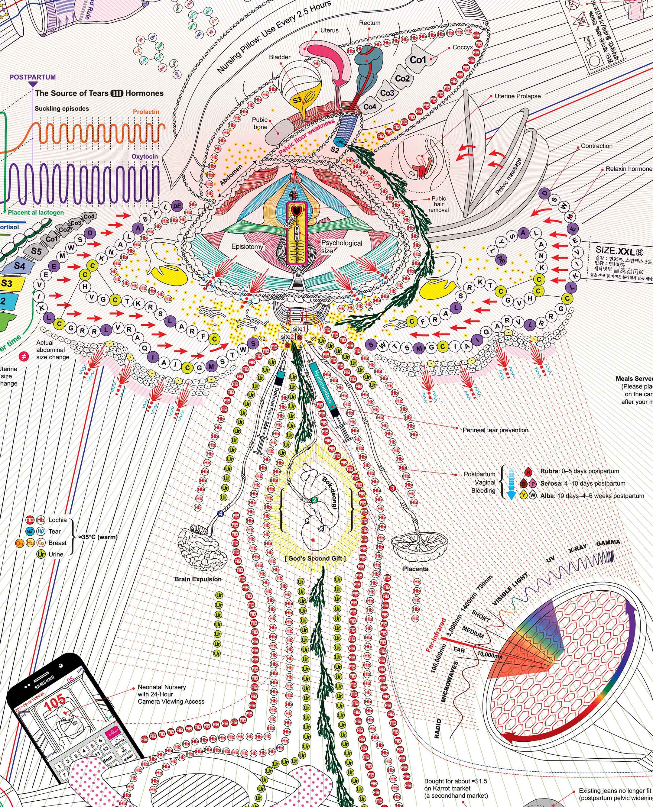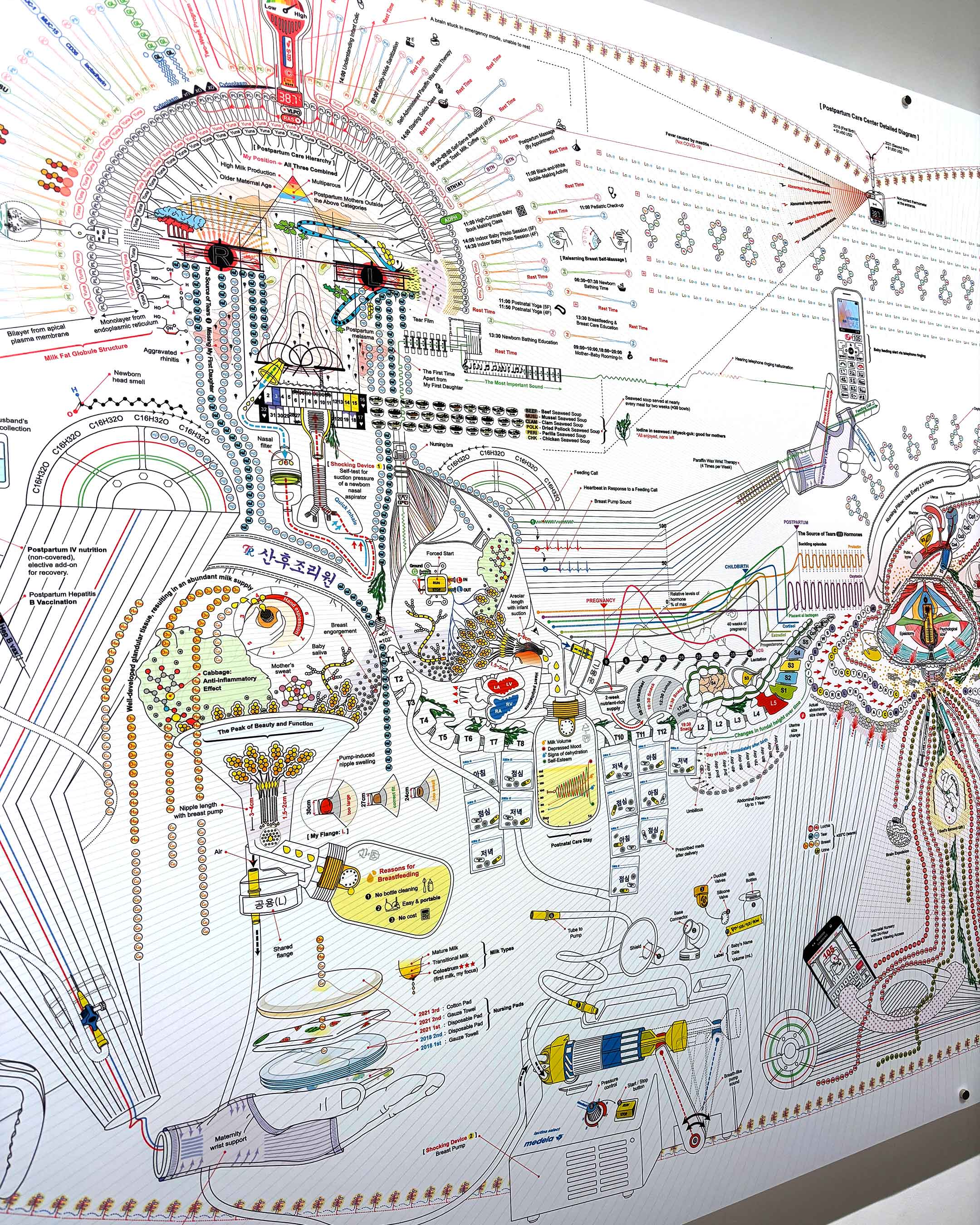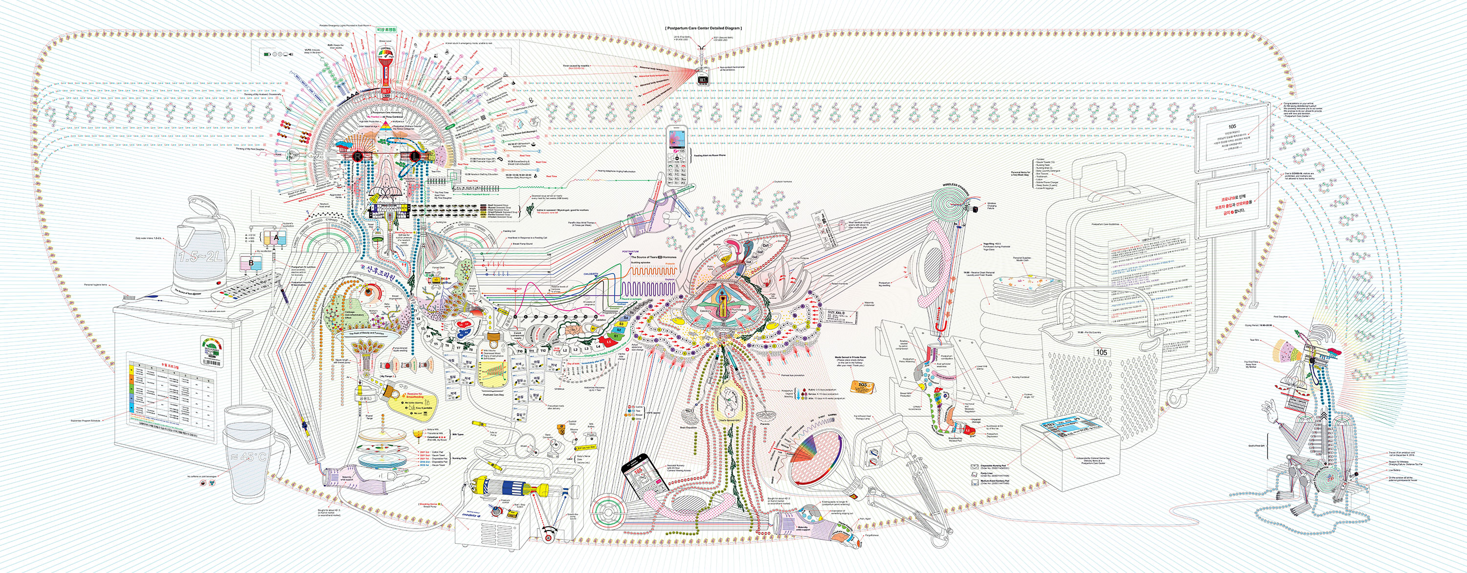 This is a detailed diagram documenting my memories of the two weeks I spent in a postpartum care center (Sanhujoriwon) after giving birth to my second child. Unique to Korea, these centers are service hubs that most Korean mothers inevitably pass through. Due to the COVID-19 pandemic at the time, all visitors were strictly barred, and I wept daily, longing for my eldest daughter. Bound by the obsession that I "must recover perfectly," the center became a place that felt like both a heaven and a prison. Through this work, I sought to record the physical and psychological changes I experienced in this isolated space.
