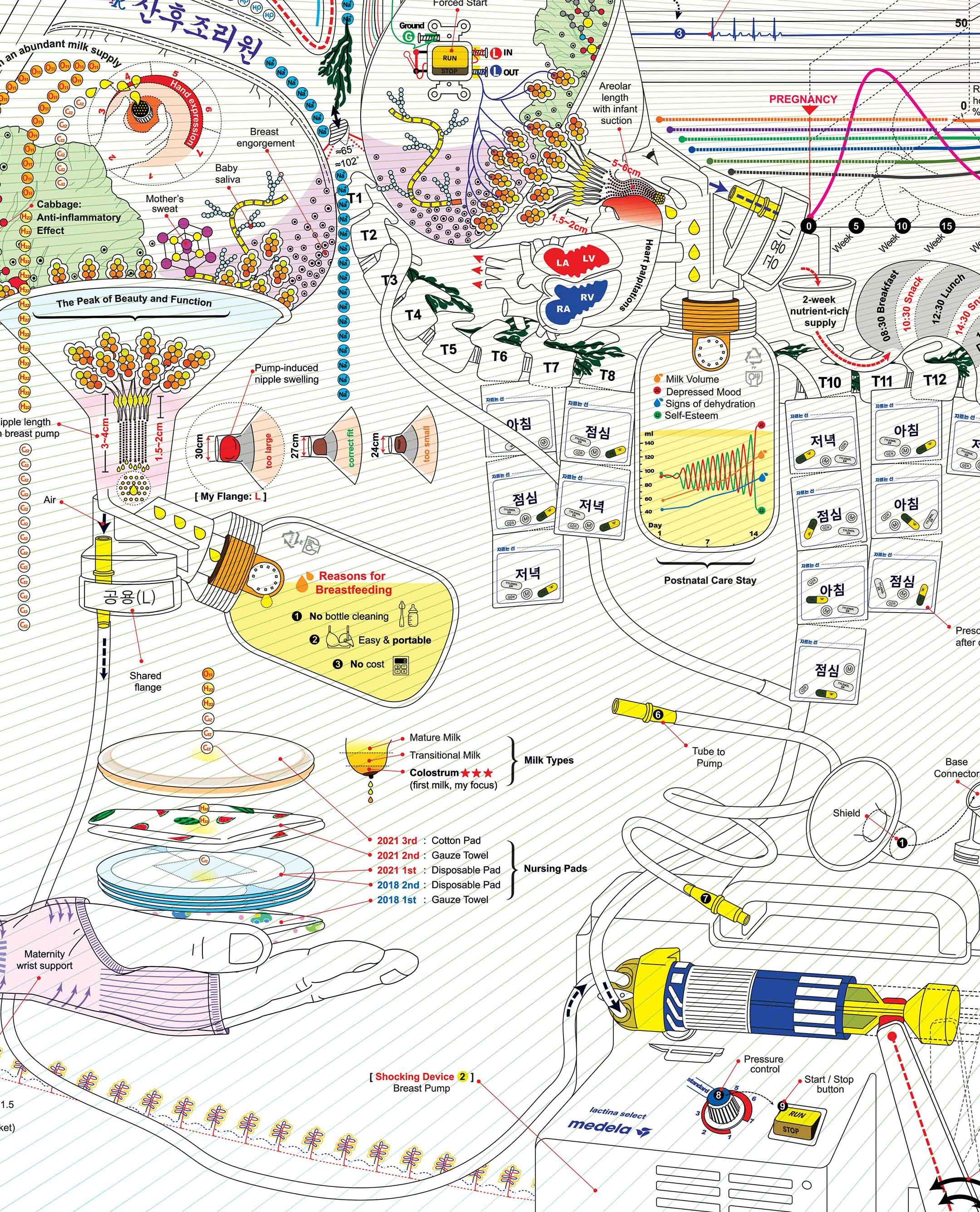 [가슴과 장기]분수처럼 솟구치는 모유는 때때로 높은 자존감이 되었다가도, 탈수와 우울감을 오가는 관계 그래프를 그려냈다. 유축기로 인해 늘어나고 부어오른 유두 탓에 가장 큰 사이즈의 공용 깔때기를 사용해야 했고, 아기의 젖물림으로 인해 고무줄처럼 한없이 늘어나는 놀라운 유두의 길이도 작품에 담았다. 팔 부분에는 출산 후 맞은 B형 간염 예방접종, 그리고 가장 좋은 영양수액을 신청했다는 남편의 말과 내가 기억하는 수액 등급 간의 차이를 다시 헤아려 보기도 했다. 젖병 밑으로는 모유 수유 패드의 변천사와 함께 유축기라는 여전히 충격적인 기기를 그려 넣었다. 심장 박동과 폐의 소리와도 같았던 유축기의 펌프 소리는 지금도 생생하다. 매끼 제공되는 고영양 식사와 간식은 허기를 달래며 간절히 기다렸고, 의심스러운 처방약들도 빠짐없이 복용했다.
